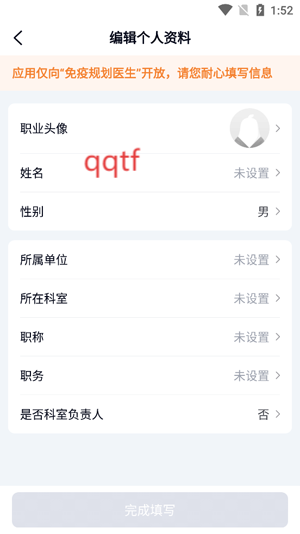 在完善资料界面根据要求填写你的个人资料,点击完成注册。